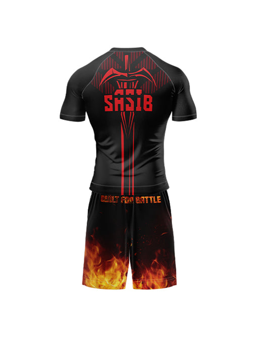 SASIB Crimson Shield Rashguard (Half Sleeves Red) + SASIB Inferno MMA Shorts (Black Orange)