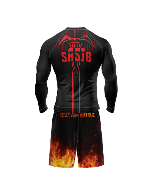 SASIB Crimson Shield Rashguard (Full Sleeves Red) + SASIB Inferno MMA Shorts (Black Orange)